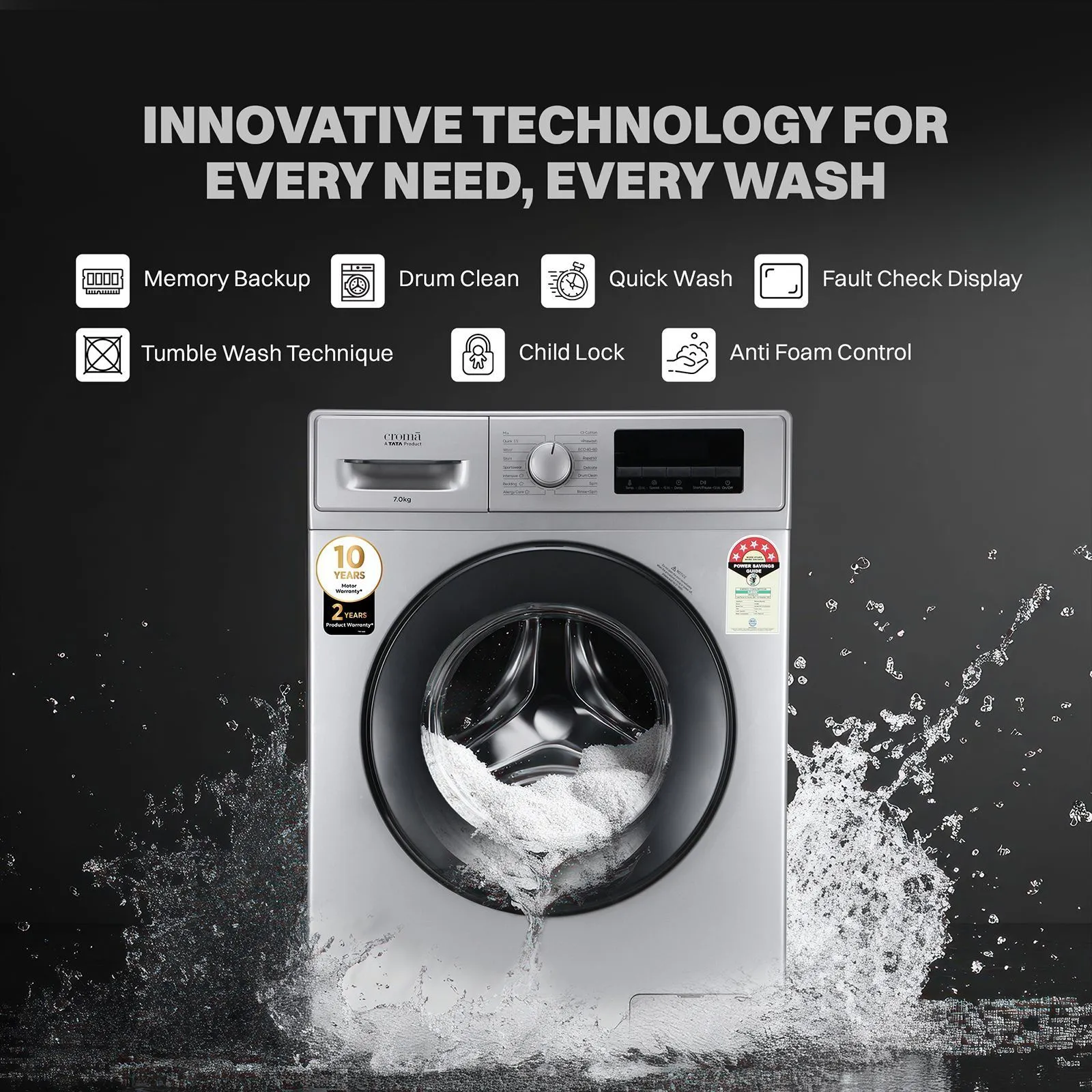 The Croma 7 kg Inverter Fully Automatic Front Load Washing Machine is designed for maximum energy efficiency with its 5-star rating. Enjoy reduced energy consumption while achieving superior washing results.