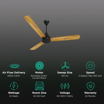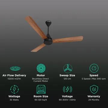 With a 1200 mm 3-blade design and a powerful 35 W ACTIVBLDC Motor, this fan ensures optimal airflow and cooling efficiency in any room. The 340 RPM Motor Speed delivers consistent and powerful airflow for maximum comfort.